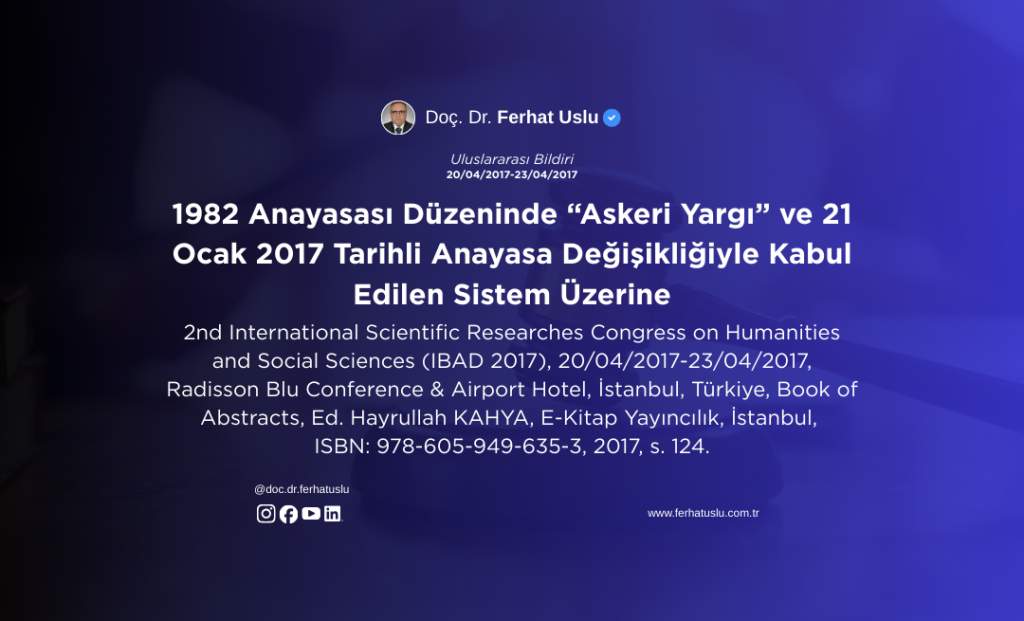 2nd International Scientific Researches Congress on Humanities and Social Sciences (IBAD 2017), 20/04/2017-23/04/2017, Radisson Blu Conference & Airport Hotel, İstanbul, Türkiye, Book of Abstracts, Ed. Hayrullah KAHYA, E-Kitap Yayıncılık, İstanbul, ISBN: 978-605-949-635-3, 2017, s. 124.