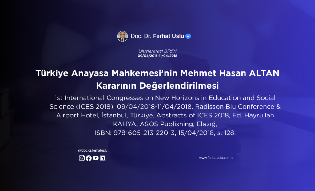 1st International Congresses on New Horizons in Education and Social Science (ICES 2018), 09/04/2018-11/04/2018, Radisson Blu Conference & Airport Hotel, İstanbul, Türkiye, Abstracts of ICES 2018, Ed. Hayrullah KAHYA, ASOS Publishing, Elazığ, ISBN: 978-605-213-220-3, 15/04/2018, s. 128.