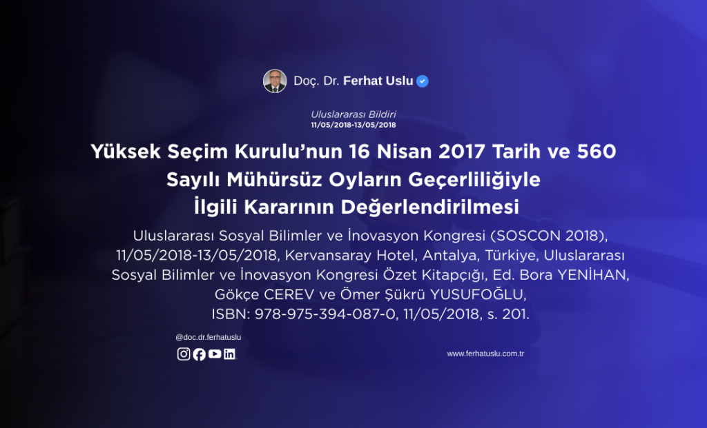 Uluslararası Sosyal Bilimler ve İnovasyon Kongresi (SOSCON 2018), 11/05/2018-13/05/2018, Kervansaray Hotel, Antalya, Türkiye, Uluslararası Sosyal Bilimler ve İnovasyon Kongresi Özet Kitapçığı, Ed. Bora YENİHAN, Gökçe CEREV ve Ömer Şükrü YUSUFOĞLU, ISBN: 978-975-394-087-0, 11/05/2018, s. 201.