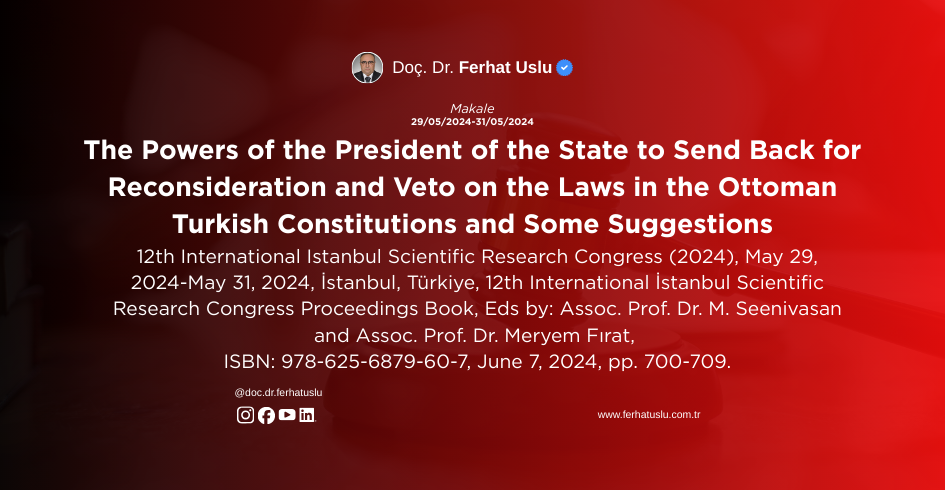 The Powers of the President of the State to Send Back for Reconsideration and Veto on the Laws in the Ottoman Turkish Constitutions and Some Suggestions